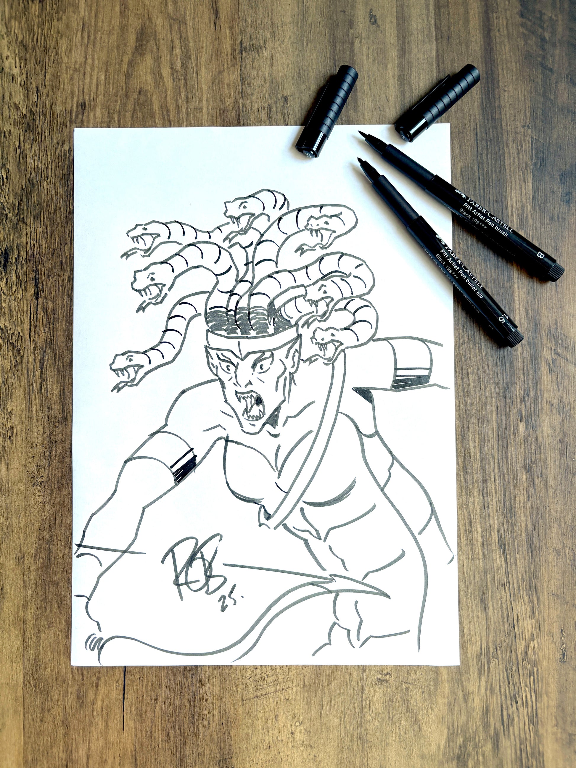 The ideal pens for outlining comic illustrations, as tested by Phoenix artist Robert Deas (creator of Fawn) in image 2!